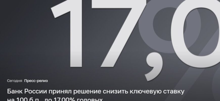 Центральный банк России вновь принял решение о снижении ключевой ставки, установив ее на уровне 17% годовых, что означает сокращение на 100 базисных пунктов. Регулятор пояснил замедление темпов снижения ставки сохраняющимися рисками усиления инфляции, возрождением активности в сфере кредитования и продолжающимися высокими инфляционными ожиданиями среди граждан. Будущие действия ЦБ по изменению ставки остаются неопределенными: дальнейшие решения будут зависеть от того, насколько стабильным будет снижение инфляции и как будут меняться инфляционные ожидания.