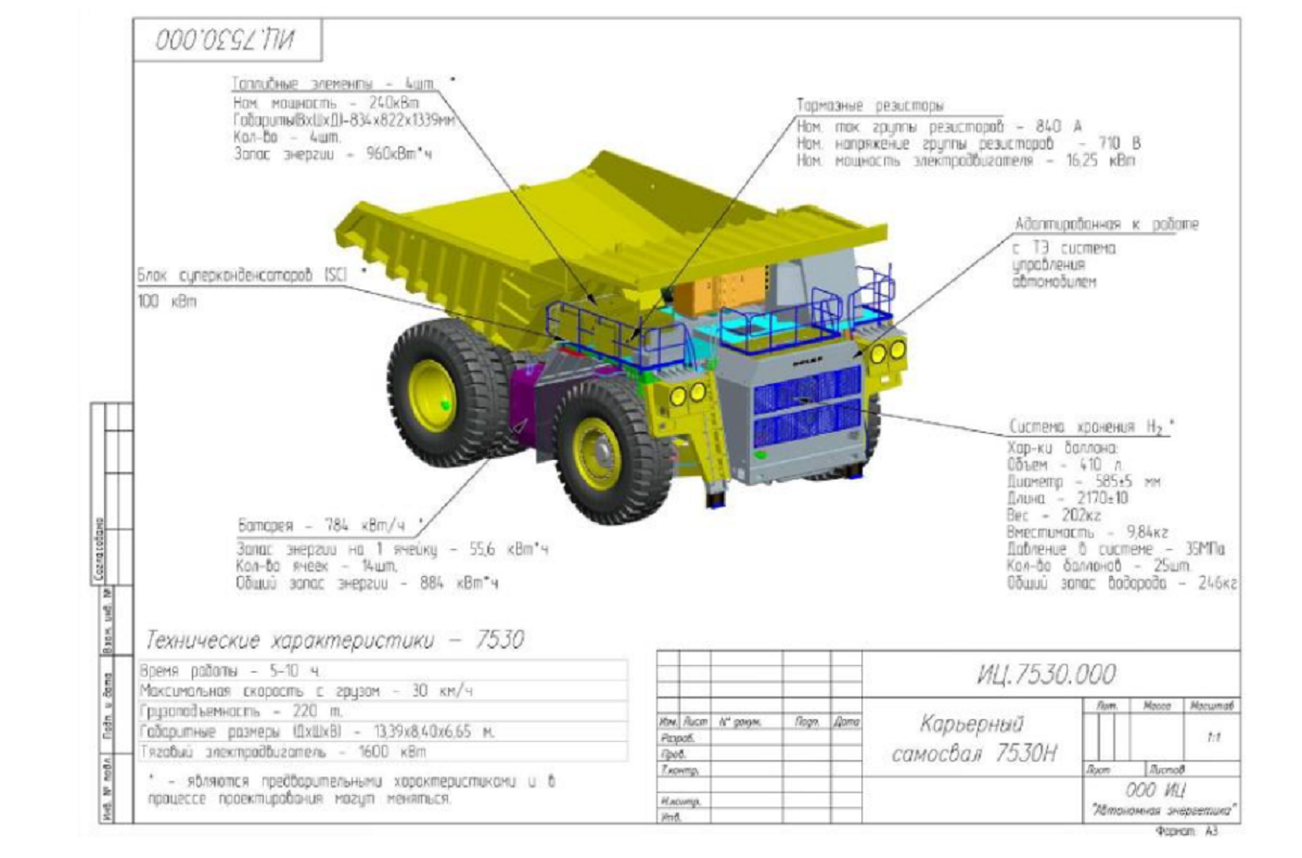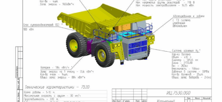 В течение текущего и следующего годов планируется изготовить и протестировать опытный образец. Самосвал БелАЗ-7530 будет оснащен генератором энергии на базе топливных элементов общей мощностью около 1 МВт, а также аккумуляторными батареями и суперконденсатором. Суперконденсатор — это электрохимическое устройство, способное быстро заряжаться и разряжаться, что позволит эффективно аккумулировать энергию при высоких токах и обеспечивать ею электрооборудование самосвала, работающее в импульсном режиме.