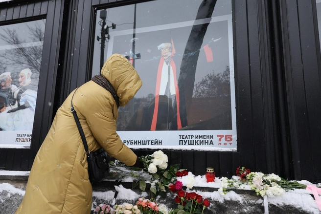 Москвичи выражают скорбь по Народной артистке России Вере Алентовой, принося цветы к зданию Театра имени Александра Пушкина.