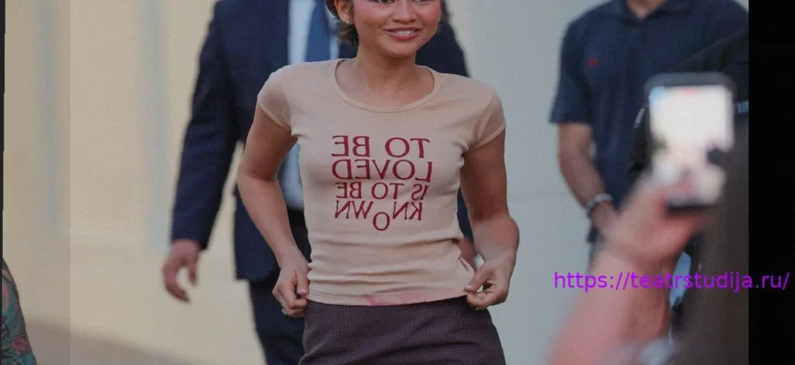 В рамках своего тура «The Drama» Зендея продолжила удивлять публику своими свадебными нарядами. На этот раз ее выбор пал на эффектную графическую футболку, ставшую частью коллаборации между Emily Dawn Long и A24, посвященной фильму.
